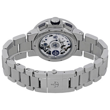 Silver-tone stainless steel case with a silver-tone stainless steel bracelet. Fixed coin edge silver-tone stainless steel bezel. Blue dial with silver-tone spade-shape hands and Roman numeral hour markers. Minute markers around the outer rim. Dial Type: Analog. Luminescent hands. Date display at the 6 o'clock position. Three sub-dials displaying: 60 second/month, 30 minute and 12 hour. Ulysse Nardin Calibre UN-153 Automatic movement, based upon Ulysse Nardin UN-150, containing 53 Jewels, bitting at 28800 vph, and has a power reserve of approximately 52 hours. Scratch resistant sapphire crystal. Screw down crown. Transparent case back. Round case shape, case size: 43 mm. Tang clasp. Water resistant at 100 meters / 330 feet. Functions: chronograph, date, hour, minute, second. Marine Series. Luxury watch style. Watch label: Swiss Made. Ulysse Nardin Marine Blue Dial Men's Automatic Watch 1533-150-7M/43.