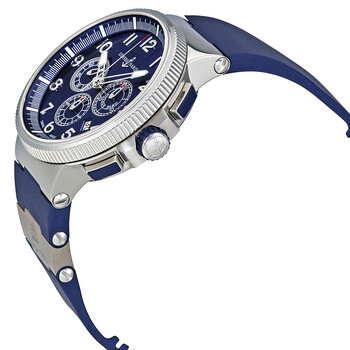 Stainless steel case with a blue rubber strap with titanium elements . Fixed stainless steel bezel. Blue dial with luminous hands and Arabic numeral hour markers. Minute markers around the outer rim. Dial Type: Analog. Luminescent hands and markers. Date display between the 4 and 5 o'clock positions. Chronograph - three sub-dials displaying: 60 second, 30 minute and 12 hour. Ulysse Nardin calibre UN-150 automatic movement with a 48-hour power reserve. Scratch resistant sapphire crystal. Screw down crown. Transparent case back. Case size: 43 mm. Case thickness: 15.20 mm. Round case shape. Push button fold over clasp. Water resistant at 100 meters / 330 feet. Functions: chronograph, date, hour, minute, second. Luxury watch style. Watch label: Swiss Made. Ulysse Nardin Marine Chronograph Automatic Men's Watch 1503-150LE-3-63-VB.