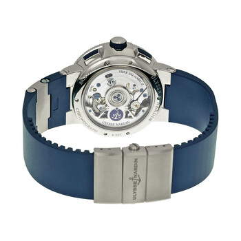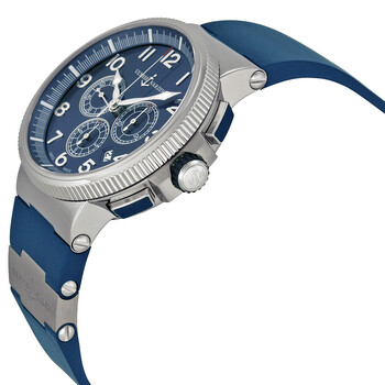 Silver-tone stainless steel case with a blue rubber withtitanium element strap. Fixed silver-tone stainless steel bezel. Blue metallic dial with silver-tone spade-shape hands and Arabic numeral hour markers. Minute markers around the outer rim. Dial Type: Analog. Luminescent hands and markers. Date display between 4 and 5 o'clock position. Chronograph - three sub-dials displaying: 60 second, 30 minute and 12 hour. Ulysse Nardin Calibre UN-150 automatic movement with a 48-hour power reserve. Scratch resistant sapphire crystal. Screw down crown. Skeleton case back. Round case shape, case size: 43 mm, case thickness: 15.3 mm. Band width: 20.3 mm, band length: 8 inches. Fold over with push button release clasp. Water resistant at 100 meters / 330 feet. Functions: chronograph, date, hour, minute, second. Luxury watch style. Watch label: Swiss Made. Item Variations: 1503 150 3 63, 1503.150.3.63, 1503150363. Ulysse Nardin Marine Chronograph Metallic Blue Dial Blue Rubber Men's Watch 1503-150-3-63.