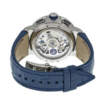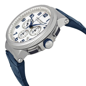Stainless steel case with a blue alligator leather strap. Fixed stainless steel bezel. White dial with blue hands and Arabic numeral hour markers. Minute markers around the outer rim. Dial Type: Analog. Luminescent hands and markers. Date display between 4 and 5 o'clock positions. Chronograph - three sub-dials displaying: 60 second, 30 minute and 12 hour. Automatic movement with a 48 hour power reserve. Scratch resistant sapphire crystal. Screw down crown. Skeleton case back. Case diameter: 43 mm. Case thickness: 15.20 mm. Round case shape. Band width: 20.3 mm. Band length: 8 inches. Push button fold over clasp. Water resistant at 100 meters / 330 feet. Functions: chronograph, date, hour, minute, second. Luxury watch style. Watch label: Swiss Made. Ulysse Nardin Marine Chronograph White Dial Automatic Men's Watch 1503-150-60.