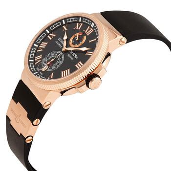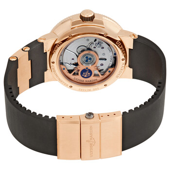 18kt rose gold case with a black rubber with 18kt rose gold elements strap. Fixed coin edge 18kt rose gold bezel. Black dial with rose gold-tone spade-shape hands and Roman numeral hour markers. Minute markers around the outer rim. Dial Type: Analog. Luminescent hands and markers. Date display at the 6 o'clock position. Two - 60 second and power reserve indicator subdials. Ulysse Nardin Calibre UN-118 Automatic movement, based upon Ulysse Nardin UN-66, containing 50 Jewels, bitting at 28800 vph, and has a power reserve of approximately 60 hours. Scratch resistant sapphire crystal. Screw down crown. Transparent case back. Round case shape, case size: 43 mm, case thickness: 13.85 mm. Band width: 22 mm. Deployment clasp. Water resistant at 100 meters / 330 feet. Functions: date, hour, minute, second, power reserve indicator, chronometer. Marine Chronometer Series. Luxury watch style. Watch label: Swiss Made. Item Variations: 1186 126 3 42, 1186.126.3.42, 1186126342. Ulysse Nardin Marine Chronometer 18kt Rose Gold Automatic Black Dial Men's Watch 1186-126-3-42.