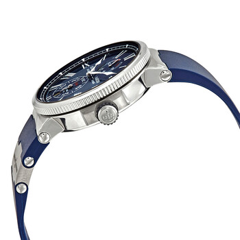 Stainless steel case with a blue rubber strap with titanium elements. Fixed stainless steel bezel. Blue dial with silver-tone spade-shape hands and Roman numeral hour markers. Minute markers around the outer rim. Dial Type: Analog. Luminescent hands and markers. Annual calander and flying tourbillon located at the 6 o'clock position. Two sub-dials displaying: month / 60 second and power reserve indicator. Ulysse Nardin calibre UN-113 automatic movement, bitting at 28800 vph, and has a power reserve of approximately 60 hours. Scratch resistant sapphire crystal. Screw down crown. Transparent case back. Round case shape. Case size: 43 mm. Deployment clasp with a push button release. Water resistant at 100 meters / 330 feet. Functions: annual calendar, month, date, hour, minute, small second, power reserve indicator. Additional Info: rubber strap with single brushed finished titanium element (brand logo engraved). Marine Chronometer Series. Luxury watch style. Watch label: Swiss Made. Ulysse Nardin Marine Chronometer Annual Calander Automatic Blue Dial Men's Watch 1133-210-3/E3.