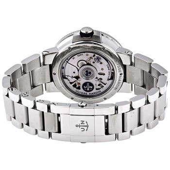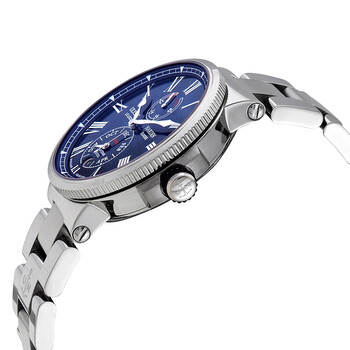 Silver-tone stainless steel case with a silver-tone stainless steel bracelet. Fixed silver-tone stainless steel bezel. Blue dial with silver-tone spade-shape hands and Roman numeral hour markers. Minute markers around the outer rim. Dial Type: Analog. Date display at the 6 o'clock position. Two sub-dials displaying: month/60 second and power reserve indicator. Ulysse Nardin Calibre UN-113 Automatic movement, bitting at 28800 vph, and has a power reserve of approximately 60 hours. Scratch resistant sapphire crystal. Screw down crown. Transparent case back. Round case shape, case size: 43 mm, case thickness: 13.85 mm. Folding clasp. Water resistant at 100 meters / 330 feet. Functions: date, hour, minute, second, power reserve, annual calendar. Marine Chronometer Annual Calendar Series. Luxury watch style. Watch label: Swiss Made. Ulysse Nardin Marine Chronometer Annual Calendar Automatic Blue Dial Men's Watch 1133-210-7M/E3.