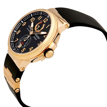 18kt rose gold case with a blue rubber strap with 18kt rose gold inserts strap. Fixed coin edge 18kt rose gold bezel. Blue dial with rose gold-tone skeleton hands and Arabic numeral hour markers. Minute markers around the outer rim. Dial Type: Analog. Luminescent hands and markers. Date display at the 6 o'clock position. Two - 60 second and power reserve subdials. Ulysse Nardin Calibre UN-118 Automatic movement, based upon Ulysse Nardin UN-66, containing 50 Jewels, bitting at 28800 vph, and has a power reserve of approximately 60 hours. Scratch resistant sapphire crystal. Screw down crown. Transparent case back. Round case shape, case size: 43 mm, case thickness: 13.85 mm. Deployment clasp. Water resistant at 100 meters / 330 feet. Functions: date, hour, minute, second, power reserve indicator, chronometer. Marine Chronometer Series. Luxury watch style. Watch label: Swiss Made. Ulysse Nardin Marine Chronometer Automatic Blue Dial 18K Rose Gold Men's Watch 1186-126-3-62.