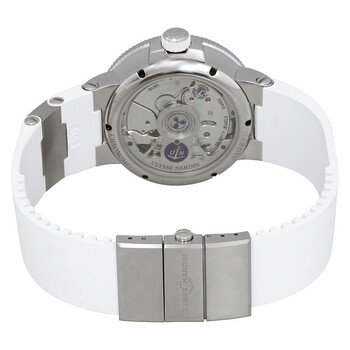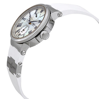 Silver-tone stainless steel case with a white rubber with titanium elements strap. Fixed silver-tone stainless steel bezel. Mother of pearl dial with black hands and Roman numeral hour markers. Minute markers around the outer rim. Dial Type: Analog. Luminescent hands. Date display at the 6 o'clock position. Ulysse Nardin Calibre UN-118 automatic movement with a 60-hour power reserve. Scratch resistant sapphire crystal. Screw down crown. Transparent case back. Round case shape, case size: 39 mm, case thickness: 13.85 mm. Band width: 22 mm. Deployment with push button release clasp. Water resistant at 30 meters / 100 feet. Functions: date, hour, minute, second, power reserve indicator, chronometer. Luxury watch style. Watch label: Swiss Made. Ulysse Nardin Marine Chronometer Automatic Ladies Watch 1183-160-3/40.