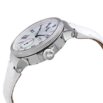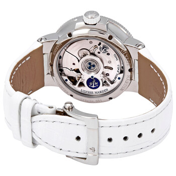 Stainless steel case with a white alligator leather strap. Fixed bezel. Mother of pearl dial with black hands and Roman numeral hour markers. Minute markers around the outer rim. Dial Type: Analog. Date display at the 6 o'clock position. Ulysse Nardin Calibre UN-118 automatic movement with a 60-hour power reserve. Scratch resistant sapphire crystal. Round case shape. Case size: 39 mm. Water resistant at 100 meters / 330 feet. Functions: date, hour, minute, second, power reserve indicator, chronometer. Luxury watch style. Watch label: Swiss Made. Ulysse Nardin Marine Chronometer Automatic Ladies Watch 1183-160/40.