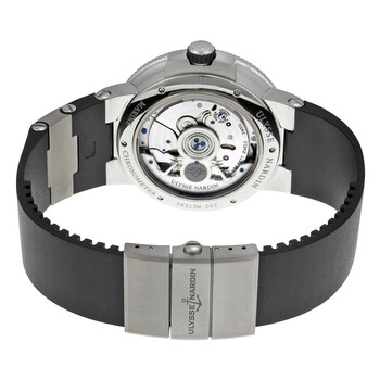 Grey titanium case with a black rubber with titanium inserts strap. Fixed grey titanium bezel. Black dial with silver-tone spade-shape hands and Roman numeral hour markers. Minute markers around the outer rim. Dial Type: Analog. Luminescent hands and markers. Date display at the 6 o'clock position. Two - 60 second and power reserve indicator subdials. Ulysse Nardin Calibre UN-118 Automatic movement, based upon Ulysse Nardin UN-66, containing 50 Jewels, bitting at 28800 vph, and has a power reserve of approximately 60 hours. Scratch resistant sapphire crystal. Screw down with rubber insert crown. Skeleton case back. Round case shape, case size: 45 mm, case thickness: 13.85 mm. Band width: 20.3 mm, band length: 8.25 inches. Fold over clasp. Water resistant at 200 meters / 660 feet. Functions: date, hour, minute, second, power reserve indicator, chronometer. Luxury watch style. Watch label: Swiss Made. Ulysse Nardin Marine Chronometer Automatic Men's Watch 1183-122-3-42-V2.