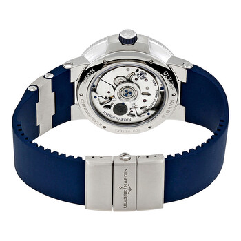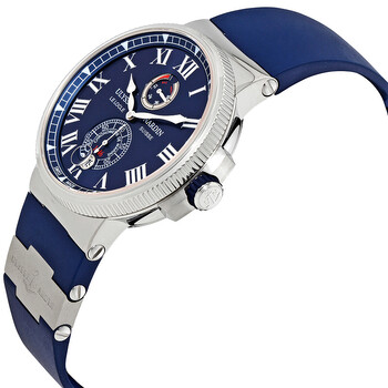 Stainless steel case with a blue rubber strap with titanium elements. Fixed stainless steel bezel. Blue dial with silver-tone spade-shape hands and Roman numeral hour markers. Minute markers around the outer rim. Dial Type: Analog. Luminescent hands and markers. Date display at the 6 o'clock position. Two- power reserve and seconds. Ulysse Nardin calibre UN-118 automatic movement, based upon Ulysse Nardin UN-66, containing 50 Jewels, bitting at 28800 vph, and has a power reserve of approximately 60 hours. Scratch resistant sapphire crystal. Screw down crown. Transparent case back. Round case shape. Case size: 45 mm. Case thickness: 13.85 mm. Deployant clasp. Water resistant at 200 meters / 660 feet. Functions: date, hour, minute, second, power reserve indicator, chronometer. Luxury watch style. Watch label: Swiss Made. Ulysse Nardin Marine Chronometer Automatic Men's Watch 1183-122-3/43.