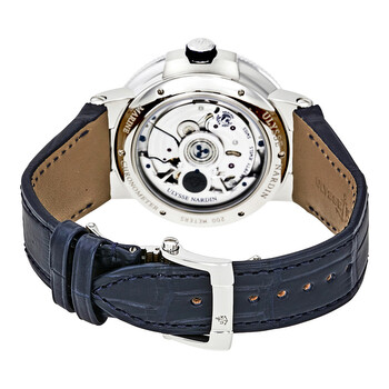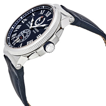 Silver-tone stainless steel case with a blue alligator leather strap. Fixed silver-tone stainless steel bezel. Blue dial with luminous silver-tone spade-shape hands and Roman numeral hour markers. Minute markers around the outer rim. Dial Type: Analog. Luminescent hands and markers. Date display at the 6 o'clock position. Two- power reserve and small seconds subdials. Ulysse Nardin Calibre UN-118 Automatic movement, based upon Ulysse Nardin UN-66, containing 50 Jewels, bitting at 28800 vph, and has a power reserve of approximately 60 hours. Scratch resistant sapphire crystal. Screw down crown. Transparent case back. Round case shape, case size: 45 mm, case thickness: 13.85 mm. Band width: 20.3 mm. Fold over with safety release clasp. Water resistant at 200 meters / 660 feet. Functions: date, hour, minute, second, power reserve indicator, chronometer. Luxury watch style. Watch label: Swiss Made. Ulysse Nardin Marine Chronometer Automatic Men's Watch 1183-122/43.