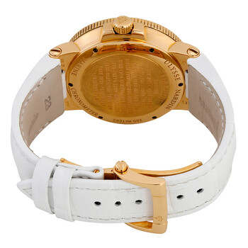 18kt rose gold case with a white (alligator) leather strap. Fixed 18kt rose gold bezel set with diamonds. Mother of pearl dial with luminous rose gold hands and index and diamond hour markers. Minute markers around the inner bezel. Dial Type: Analog. Date display at the 6 o'clock position. Small seconds sub-dial. Power reserve indicator. Automatic movement with a 42 hour power reserve. Scratch resistant sapphire crystal. Screw down crown. Solid case back. Case diameter: 41 mm. Case thickness: 12.5 mm. Round case shape. 18kt rose gold deployment clasp. Water resistant at 200 meters / 660 feet. Functions: date, hour, minute, second. Luxury watch style. Watch label: Swiss Made. Ulysse Nardin Marine Chronometer Automatic Mother of Pearl Diamond DIal 18kt Rose Gold White Leather Ladies Watch 266-66B-991.