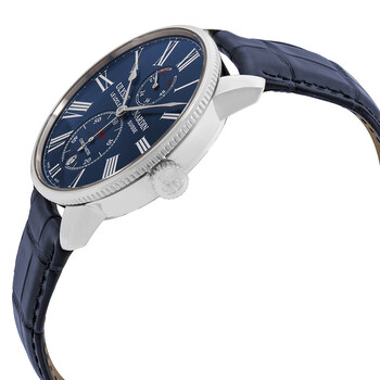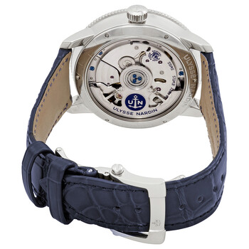 Stainless steel case with a blue (alligator) leather strap. Fixed coin edge stainless steel bezel. Blue dial with silver-tone spade-shape hands and Roman numeral hour markers. Minute markers around the outer rim. Dial Type: Analog. Date display at the 6 o'clock position. Two displays showing: 60 seconds and power reserve. Ulysse Nardin calibre UN-118 automatic movement, based upon Ulysse Nardin UN-66, containing 50 Jewels, bitting at 28800 vph, and has a power reserve of approximately 60 hours. Scratch resistant sapphire crystal. Screw down crown. Transparent case back. Round case shape. Case size: 42 mm. Case thickness: 11.4 mm. Band width: 20 mm. Fold over clasp with a push button release. Water resistant at 50 meters / 165 feet. Functions: date, hour, minute, second, power reserve. Marine Chronometer Torpilleur Series. Luxury watch style. Watch label: Swiss Made. Ulysse Nardin Marine Chronometer Torpilleur Automatic Men's Watch 1183-310/43.