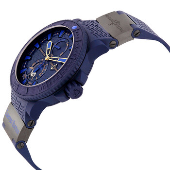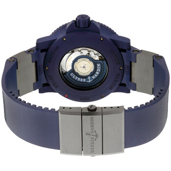 Blue rubber-clad stainless steel case with a blue rubber strap with black ceramic elements. Uni-directional rotating blue rubber-clad bezel. Blue dial with blue luminous hands and index hour markers. Minute markers around the outer rim. Dial Type: Analog. Luminescent hands and markers. Date display at the 6 o'clock position. Two displays showing: seconds and power reserve. Automatic movement with a 42-hour power reserve. Scratch resistant sapphire crystal. Screw down crown. Transparent case back. Case diameter: 45.8 mm. Case thickness: 14.8 mm. Round case shape. Fold over clasp with push button release. Water resistant at 200 meters / 660 feet. Functions: date, hour, minute, second. Watch label: Swiss Made. Ulysse Nardin Marine Diver Blue Ocean Automatic Blue Dial Blue Rubber Men's Watch 263-99LE-3C.