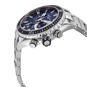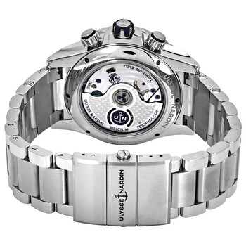 Stainless steel case with a stainless steel bracelet. Uni-directional rotating stainless steel bezel with a blue rubber inlay. Blue wave dial with luminous silver-tone hands and index hour markers. Minute markers. Tachymeter markings around the outer rim. Dial Type: Analog. Luminescent hands and markers. Date display at the 6 o'clock position. Chronograph - three sub-dials displaying: 60 second, 30 minute and 12 hours. Ulysse Nardin calibre UN-150 automatic movement with a 48-hour power reserve. Scratch resistant sapphire crystal. Screw down crown. Transparent case back. Round case shape. Case size: 44 mm. Deployment clasp with a push button release. Water resistant at 300 meters / 1000 feet. Functions: chronograph, tachymeter, date, hour, minute, second. Luxury watch style. Watch label: Swiss Made. Ulysse Nardin Marine Diver Blue Wave Dial Chronograph Automatic Men's Watch 1503-151-7M/93.