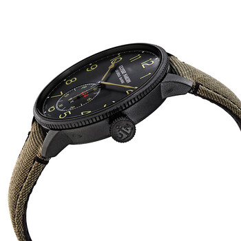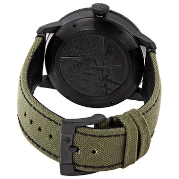 Black PVD stainless steel case with a green fabric strap. Fixed coin edge black PVD bezel. Black dial with light green spade-shape hands and Arabic numeral hour markers. Minute markers around the outer rim. Dial Type: Analog. Small seconds sub-dial. Ulysse Nardin calibre UN-118 automatic movement, based upon Ulysse Nardin UN-66, containing 50 Jewels, bitting at 28800 vph, and has a power reserve of approximately 60 hours. Scratch resistant sapphire crystal. Screw down crown. Solid case back. Round case shape. Case size: 44 mm. Band width: 20 mm. Tang clasp. Water resistant at 50 meters / 165 feet. Functions: hour, minute, second, power reserve indicator, chronometer. Additional Info: limited edition of 300 pieces. Marine Torpilleur Series. Luxury watch style. Watch label: Swiss Made. Ulysse Nardin Marine Torpilleur Limited Edition Automatic Chronometer Black Dial Men's Watch 1183-320LE/BLACK.