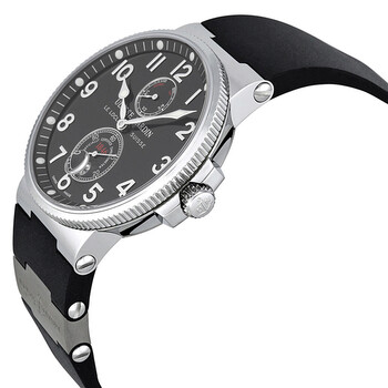 Stainless steel case with a black rubber strap with titanium inserts. Fixed stainless steel bezel. Black dial with silver-tone hands and Arabic numeral hour markers. Minute markers around the outer rim. Dial Type: Analog. Luminescent hands and markers. Date display at the 6 o'clock position. Two sub-dials displaying: small second and power reserve indicator. Automatic movement. Scratch resistant sapphire crystal. Screw down crown. Solid case back. Case diameter: 41 mm. Case thickness: 12.5 mm. Round case shape. Strap width: 21 mm. Deployment clasp. Water resistant at 200 meters / 660 feet. Functions: date, hour, minute, second, power reserve indicator. Luxury watch style. Watch label: Swiss Made. Ulysse Nardin Maxi Marine Automatic Black Dial Men Watch 263-66-3/62.