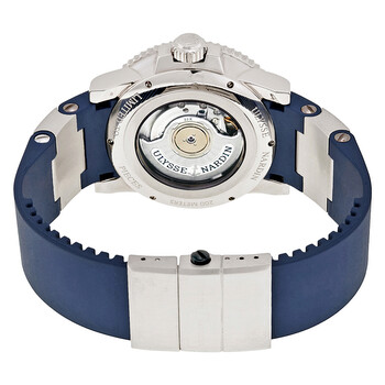 18kt white gold case with a blue rubber with 18kt white gold strap. Uni-directional rotating 18kt white gold bezel. Blue dial with luminous silver-tone hands and index hour markers. Minute markers around the outer rim. Dial Type: Analog. Luminescent hands and markers. Date display at the 6 o'clock position. Seconds and power reserve subdials. Ulysse Nardin calibre UN-26 automatic movement with a 42-hour power reserve. Scratch resistant sapphire crystal. Screw down crown. Solid case back. Case size: 42.7 mm. Case thickness: 12.5 mm. Round case shape. Deployment clasp with a push button release. Water resistant at 200 meters / 660 feet. Functions: date, hour, minute, second, power reserve indicator, chronometer. Casual watch style. Watch label: Swiss Made. Ulysse Nardin Maxi Marine Blue Dial Rubber / White Gold Men's Watch 260323A.