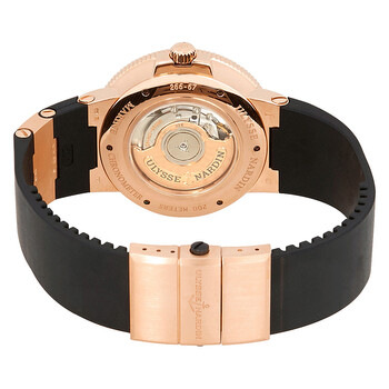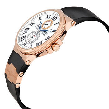 18kt rose gold case with a black rubber strap. Fixed bezel. White dial with blue hands and Roman numeral hour markers. Dial Type: Analog. Luminescent hands and markers. Date display at the 6 o'clock position. Two small seconds and power reserve subdials. Ulysse Nardin Calibre UN-26 automatic movement with a 42-hour power reserve. Scratch resistant sapphire crystal. Screw down crown. Round case shape, case size: 43 mm, case thickness: 12 mm. Water resistant at 200 meters / 660 feet. Functions: date, hour, minute, second, power reserve. Luxury watch style. Watch label: Swiss Made. Item Variations: 266 67 3 40, 266.67.3.40, 26667340. Ulysse Nardin Maxi Marine Chronometer Automatic White Dial Men's Watch 266-67-3-40.