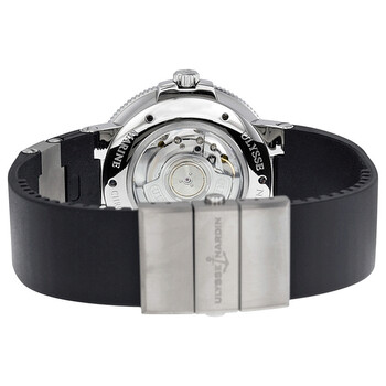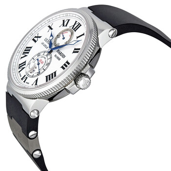 Stainless steel case with a black rubber strap with grey titanium elements. Fixed stainless steel bezel. White dial with luminous blue hands and Roman numeral hour markers. Minute markers around the outer rim. Dial Type: Analog. Luminescent hands. Date display above the 6 o'clock position. Small seconds sub-dial. Power reserve indicator. Ulysse Nardin calibre UN-26 automatic movement, containing 28 Jewels, bitting at 28800 vph, and has a power reserve of approximately 42 hours. Scratch resistant sapphire crystal. Screw down crown. Transparent case back. Round case shape. Case size: 43 mm. Case thickness: 12 mm. Band width: 22 mm. Deployment clasp with a push button release. Water resistant at 200 meters / 660 feet. Functions: date, hour, minute, second, power reserve indicator, chronometer. Maxi Marine Series. Luxury watch style. Watch label: Swiss Made. Ulysse Nardin Maxi Marine Chronometer White Dial Men's Watch 263-67-3-40.