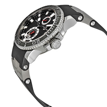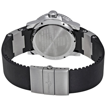 Stainless steel case with a black rubber with titanium integrated elements strap. Unidirectional stainless steel bezel. Black textured dial with luminous hands and index hour markers. Minute markers around the outer rim. Dial Type: Analog. Luminescent hands and markers. Date display at the 6 o'clock position. Two: power reserve and seconds subdials. Ulysse Nardin Calibre UN-26 automatic movement with about 48 hours of power reserve. Scratch resistant sapphire crystal. Screw down crown. Solid case back. Case size: 42.7 mm. Case thickness: 12.5 mm. Round case shape. Fold over with push button release clasp. Water resistant at 300 meters / 1000 feet. Functions: date, hour, minute, second, power reserve indicator, chronometer. Dress watch style. Watch label: Swiss Made. Ulysse Nardin Maxi Marine Diver Automatic Men's Watch 263-33-3-92.