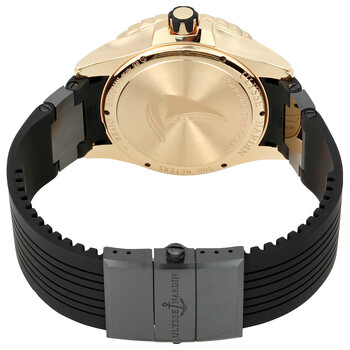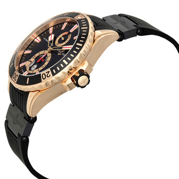 18kt rose gold case with a black rubber strap. Uni-directional rotating coin edge 18kt rose gold bezel with a black count-up elapsed time top ring. Black with wave design dial with luminous rose gold-tone skeleton hands and index hour markers. Minute markers around the outer rim. Dial Type: Analog. Luminescent hands and markers. Date display at the 6 o'clock position. Two sub-dials displaying: small second and power reserve indicator. Ulysse Nardin Calibre UN-26 Automatic movement, containing 28 Jewels, bitting at 28800 vph, and has a power reserve of approximately 42 hours. Scratch resistant sapphire crystal. Screw down crown. Solid case back. Round case shape, case size: 44 mm. Deployment with push button release clasp. Water resistant at 300 meters / 1000 feet. Functions: date, hour, minute, second, power reserve indicator, chronometer. Maxi Marine Diver Series. Luxury watch style. Watch label: Swiss Made. Ulysse Nardin Maxi Marine Diver Automatic Men's Watch 266-10-3C/92.