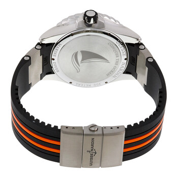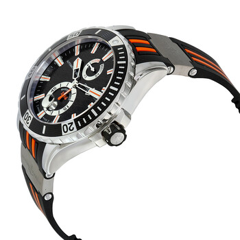 Silver-tone stainless steel case with a two-tone (black and orange) rubber strap. Uni-directional rotating coin edge stainless steel bezel with a black rubber inlay count-up elapsed time top ring. Black dial with luminous silver-tone skeleton hands and index hour markers. Minute markers around the outer rim. Dial Type: Analog. Luminescent hands and markers. Date display at the 6 o'clock position. Two sub-dials displaying: small second and power reserve indicator. Ulysse Nardin Calibre UN-26 Automatic movement, containing 28 Jewels, bitting at 28800 vph, and has a power reserve of approximately 42 hours. Scratch resistant sapphire crystal. Screw down crown. Solid case back. Round case shape, case size: 44 mm. Band width: 20.3 mm. Fold over with push button release clasp. Water resistant at 300 meters / 1000 feet. Functions: date, hour, minute, second, power reserve indicator, chronometer. Maxi Marine Series. Luxury watch style. Watch label: Swiss Made. Ulysse Nardin Maxi Marine Diver Automatic Men's Watch 263-10-3-952.
