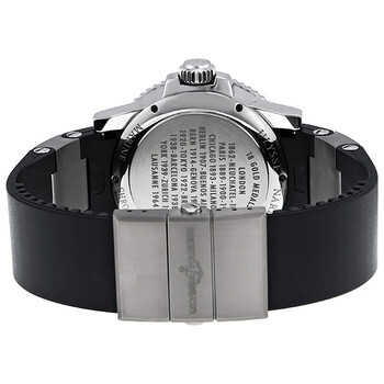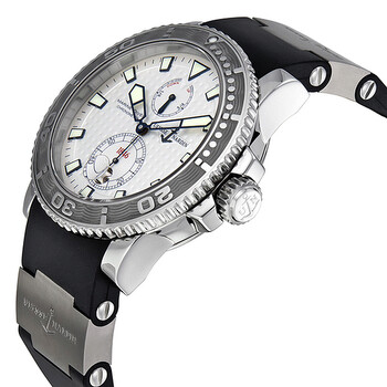 Stainless steel case with a black rubber strap. Uni-directional rotating stainless steel bezel. Silver dotted dial with luminous hands and stick hour markers. Minute markers around the outer rim. Dial Type: Analog. Luminescent hands and markers. Date display appears at the 6 o'clock position. Small seconds sub-dial at the 6 o'clock position. Power reserve sub-dial at the 12 o'clock position. Automatic movement with 48-hour power reserve. Scratch resistant sapphire crystal. Screw down crown. Solid case back. Case diameter: 42.7 mm. Case thickness: 12 mm. Round case shape. Band width: 22 mm. Band length: 8 inches. Deployment clasp with push button. Water resistant at 300 meters / 1000 feet. Functions: date, hour, minute, second. Luxury watch style. Watch label: Swiss Made. Ulysse Nardin Maxi Marine Diver Automatic Silver Dotted Dial Men's Watch 263-33-3.