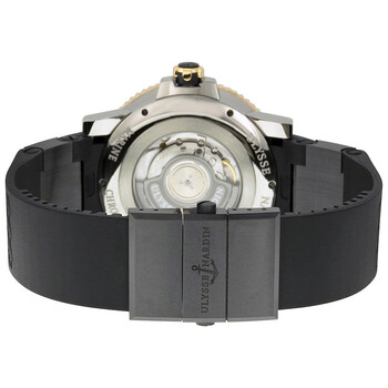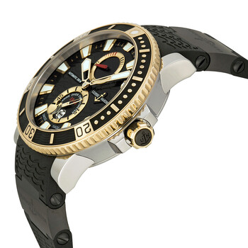 Titanium case with a black rubber with black ceramic elements. strap. Uni-directional rotating coin edge 18kt rose gold bezel with a black count-up elapsed time top ring. Black dial with luminous gold-tone skeleton sword-shaped hands and index hour markers. Minute markers around the outer rim. Dial Type: Analog. Luminescent hands and markers. Date display at the 6 o'clock position. Two sub-dials displaying: small second and power reserve indicator. Ulysse Nardin Calibre UN-26 Automatic movement, containing 28 Jewels, bitting at 28800 vph, and has a power reserve of approximately 42 hours. Scratch resistant sapphire crystal. Screw down crown. Transparent case back. Round case shape, case size: 45 mm, case thickness: 14.6 mm. Band width: 20.3 mm, band length: 8 inches. Fold over with push button release clasp. Water resistant at 200 meters / 660 feet. Functions: date, hour, minute, second, power reserve indicator, chronometer. Maxi Marine Diver Series. Dress watch style. Watch label: Swiss Made. Ulysse Nardin Maxi Marine Diver Black Dial Black Rubber Men's Watch 265-90-3C-92.