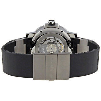 Grey titanium case with a black rubber strap with titanium elements. Uni-directional grey titanium bezel with an inlaid black and orange titanium ring. Black "wave" dial with luminous hands and index hour markers. Minute markers around the outer rim. Dial Type: Analog. Luminescent hands and markers. Date display at the 6 o'clock position. Two sub-dials displaying: power reserve and 60 second. Ulysse Nardin calibre UN-26 automatic movement, containing 28 Jewels, bitting at 28800 vph, and has a power reserve of approximately 42 hours. Scratch resistant sapphire crystal. Screw down crown. Skeleton case back. Round case shape. Case size: 45 mm. Case thickness: 14.6 mm. Band width: 22 mm. Band length: 8.5 inches. Fold over clasp with a push button release. Water resistant at 200 meters / 660 feet. Functions: date, hour, minute, second, power reserve indicator, chronometer. Maxi Marine Diver Series. Luxury watch style. Watch label: Swiss Made. Ulysse Nardin Maxi Marine Diver Black Dial Titanium Men's Watch 263-90-3-92.