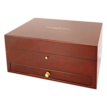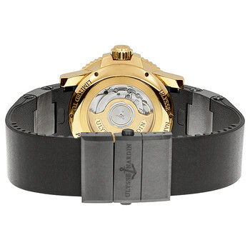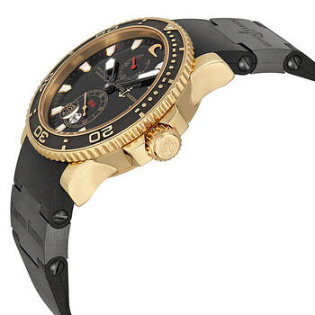 18kt rose gold case with a black rubber strap with black ceramic elements. Uni-directional rotating 18kt rose gold bezel with black rubber inlay. Black dial with luminous skeleton hands and index hour markers. Minute markers around the outer rim. Dial Type: Analog. Luminescent hands and markers. Date display at the 6 o'clock position. Two - seconds and power reserve subdials. Ulysse Nardin calibre UN-26 automatic movement with a 42-hour power reserve. Scratch resistant sapphire crystal. Screw down 18kt rose gold crown. Transparent case back. Round case shape. Case size: 42.7 mm. Case thickness: 12.5 mm. Band width: 22 mm. Fold over clasp with a push button release. Water resistant at 300 meters / 1000 feet. Functions: date, hour, minute, second, power reserve indicator, chronometer. Additional Info: suitable for scuba diving to a depth of 30 meters for up to 2 hours. Luxury watch style. Watch label: Swiss Made. Item Variations: 266 37LE 3B, 266.37LE.3B, 26637LE3B. Ulysse Nardin Maxi Marine Diver Black Surf Men's Watch 266-37LE-3B.