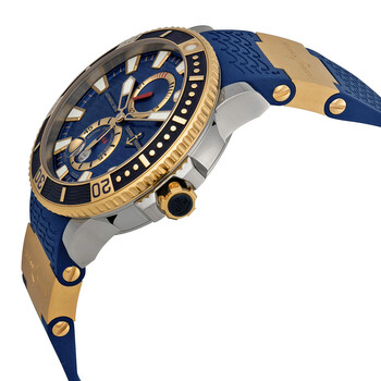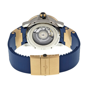 Titanium and 18kt rose gold case with a blue rubber and 18kt rose gold elements strap. Uni-directional rotating coin edge 18kt rose gold bezel with a blue count-up elapsed time top ring. Blue dial with luminous skeleton sword-shaped hands and index hour markers. Minute markers around the outer rim. Dial Type: Analog. Luminescent hands and markers. Date display at the 6 o'clock position. Two sub-dials displaying: small second and power reserve indicator. Ulysse Nardin Calibre UN-26 Automatic movement, containing 28 Jewels, bitting at 28800 vph, and has a power reserve of approximately 42 hours. Scratch resistant sapphire crystal. Screw down crown. Skeleton case back. Round case shape, case size: 45 mm, case thickness: 14.6 mm. Band width: 20.3 mm, band length: 8 inches. Deployment with push button release clasp. Water resistant at 200 meters / 660 feet. Functions: date, hour, minute, second, power reserve indicator, chronometer. Maxi Marine Diver Series. Luxury watch style. Watch label: Swiss Made. Ulysse Nardin Maxi Marine Diver Blue Dial 18kt Rose Gold Titanium Men's Watch 265-90-3-93.