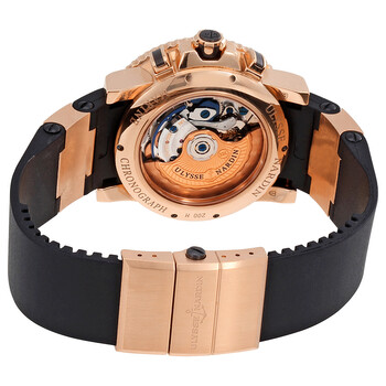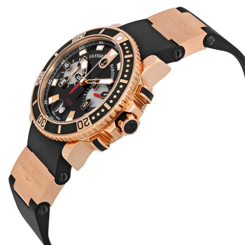 18kt rose gold case with a black rubber strap with 18kt rose gold inserts. Uni-directional rotating 18kt rose gold bezel with a black rubber-type inlay. Black dial with luminous rose gold hands and index hour markers. Minute markers around the outer rim. Dial Type: Analog. Luminescent hands and markers. Date display at the 6 o'clock position. Chronograph - two sub-dials displaying: 60 second and 30 minute. Automatic movement with a 42 hour power reserve. Scratch resistant sapphire crystal. Pull / push crown. Transparent case back. Case diameter: 42.7 mm. Case thickness: 15.8 mm. Round case shape. Band width: 20.3 mm. Band length: 8 inches. Deployant clasp. Water resistant at 200 meters / 660 feet. Functions: chronograph, date, hour, minute, second. Luxury watch style. Watch label: Swiss Made. Ulysse Nardin Maxi Marine Diver Chronograph Black Dial 18 Carat Rose Gold Case Black Rubber Band Men's Automatic Watch 8006-102-3a/92.