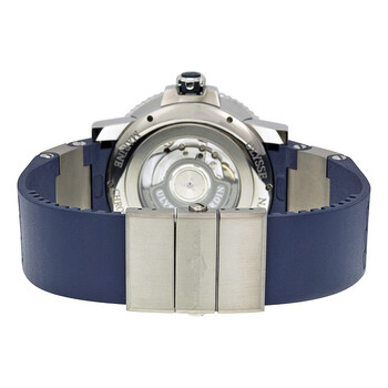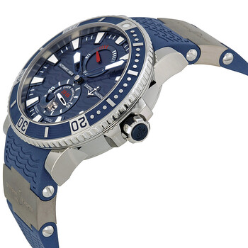 Grey titanium case with a blue rubber (waves design) strap with titanium inserts. Uni-directional rotating coin edge stainless steel bezel with an inlaid blue (count-up elapsed time) ring. Blue (waves design) dial with luminous blue skeleton sword-shaped hands and index hour markers. Minute markers around the outer rim. Dial Type: Analog. Luminescent hands and markers. Date display above the 6 o'clock position. Two sub-dials displaying: small second and power reserve. Ulysse Nardin calibre UN-26 automatic movement, containing 28 Jewels, bitting at 28800 vph, and has a power reserve of approximately 42 hours. Scratch resistant sapphire crystal. Screw down crown. Transparent case back. Round case shape. Case size: 45 mm. Case thickness: 14.6 mm. Band width: 22 mm. Deployment clasp with a push button release. Water resistant at 200 meters / 660 feet. Functions: date, hour, minute, second, power reserve indicator, chronometer. Maxi Marine Diver Titanium Series. Sport watch style. Watch label: Swiss Made. Item Variations: 263 90 3 93, 263.90.3.93, 26390393. Ulysse Nardin Maxi Marine Diver Titanium Blue Dial Blue Rubber Men's Watch 263-90-3-93.
