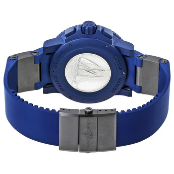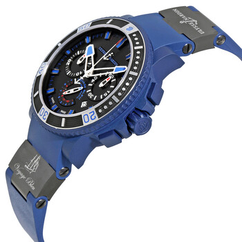 Blue rubber coated stainless steel case with a blue rubber strap. Black dial with luminous silver-tone hands and index hour markers. Minute markers around the outer rim. Dial Type: Analog. Date display between 4 and 5 o'clock position. Chronograph - three sub-dials displaying: 60 second, 30 minute and 12 hour. Automatic movement. Scratch resistant sapphire crystal. Solid case back. Case size: 45.8 mm. Case thickness: 16.40 mm. Round case shape. Push button deployment clasp. Water resistant at 200 meters / 660 feet. Functions: chronograph, date, hour, minute, second. Luxury watch style. Watch label: Swiss Made. Ulysse Nardin Maxi Marine Diver Voyage Bleu Limited Edition Men's Watch 35398LE3CVB.