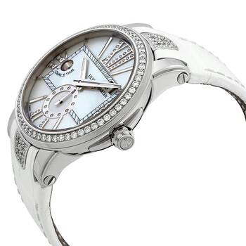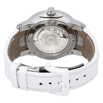 Stainless steel case with a white leather strap. Fixed stainless steel bezel. Mother of pearl dial with silver-tone hands and index hour markers. Dial Type: Analog. Luminescent hands and markers. Date display at the 2 o'clock position. Small seconds sub-dial subdials. Ulysse Nardin Calibre UN-24 automatic movement with a 42-hour power reserve. Scratch resistant sapphire crystal. Pull / push crown. Round case shape, case size: 40 mm, case thickness: 12.8 mm. Fold over with safety release clasp. Water resistant at 50 meters / 165 feet. Functions: GMT, second time zone, date, hour, minute, second. Dress watch style. Watch label: Swiss Made. Ulysse Nardin Mother of Pearl Diamond Dial Stainless Steel White Leather Ladies Watch 243-10B-391.