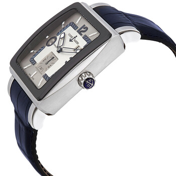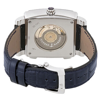 Stainless steel case with a black leather strap. Fixed bezel. Silver dial with luminous hands and index hour markers. Minute markers around the outer rim. Dial Type: Analog. Date display at the 2 o'clock position. Small seconds sub-dial. Automatic movement. Scratch resistant sapphire crystal. Screw down crown. Case diameter: 42 mm x 42 mm. Case thickness: 12.2 mm. Rectangle case shape. Deployant clasp. Water resistant at 50 meters / 165 feet. Functions: GMT, second time zone, hour, minute, second. Luxury watch style. Watch label: Swiss Made. Ulysse Nardin Quadrato Dual Time Silver Dial Black Leather Automatic Men's Watch 243-92CER-601.