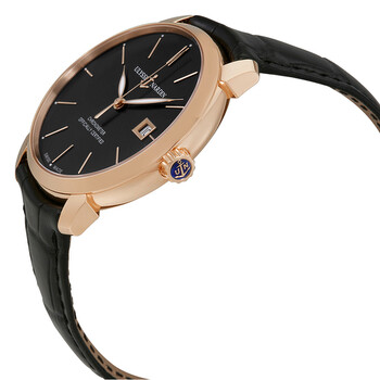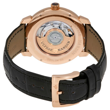 18kt rose gold case with a black leather strap. Fixed bezel. Black dial with luminous hands and index hour markers. Dial Type: Analog. Date display appears at the 3 o'clock position. Automatic movement. Scratch resistant sapphire crystal. Pull / push crown. Case diameter: 40 mm. Round case shape. Tang clasp. Water resistant at 50 meters / 165 feet. Functions: hour, minute, second, date. Luxury watch style. Watch label: Swiss Made. Ulysse Nardin San Marco Classico Black Dial 18kt Rose Gold Black Leather Men's Watch 8156-111-2-92.