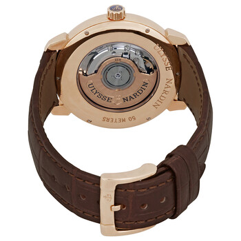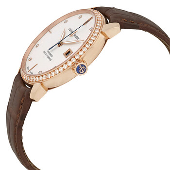 18kt rose gold case with a brown leather strap. Fixed bezel set with diamonds bezel. Ivory dial with luminous hands and diamond hour markers. Hour, minute, second, date. Dial Type: Analog. Date display at the 3 o'clock position. Automatic movement. Scratch resistant sapphire crystal. Pull / push crown. Case diameter: 40 mm. Round case shape. Tang clasp. Water resistant at 50 meters / 165 feet. Functions: date, hour, minute, second. Luxury watch style. Watch label: Swiss Made. Ulysse Nardin San Marco Classico Ivory Dial 18kt Rose gold Diamond Brown Leather Men's Watch 8156-111B-2-991.