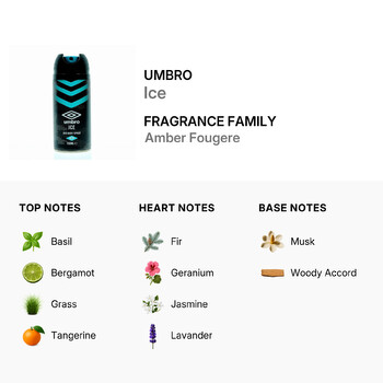 Belonging to the Amber Fougere fragrance family, Umbro ICE opens with crisp top notes of basil, bergamot, grass, and tangerine. These natural, zesty elements create an instant sense of freshness. As the scent develops, heart notes of fir, geranium, jasmine, and lavender bring out a clean, slightly floral tone that adds depth without overpowering. Finally, base notes of musk and woody accords leave a smooth, masculine trail that lingers with confidence.