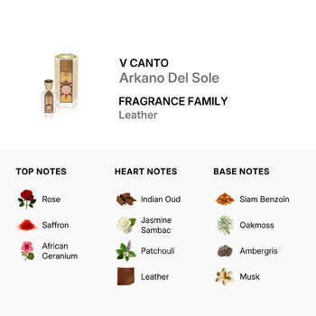 Arkano Del Sole belongs to the Leather fragrance family, delivering a bold yet refined character that suits every season and occasion. The top notes open with a floral-spice fusion of velvety Rose, exotic Saffron, and crisp African Geranium, creating an inviting introduction that instantly captivates the senses.
