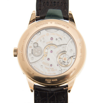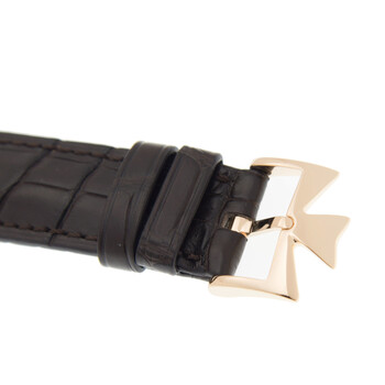 18kt rose gold case with a dark brown leather strap. Fixed 18kt rose gold bezel. Silver dial with rose gold-tone hands and Roman numeral hour markers. Dial Type: Analog. Pointer date. One subdial displaying: small second (inner moonphase display). Vacheron Constantin Calibre 4400 QCL Hand Wind movement, containing 253 Jewels, bitting at 28800 vph, and has a power reserve of approximately 65 hours. Scratch resistant sapphire crystal. Transparent case back. Round case shape, case size: 40 mm, case thickness: 10.35 mm. Water resistant at 30 meters / 100 feet. Functions: perpetual calendar, month, date, day, hour, minute, small second. Additional Info: limited edition of 200 pieces. Historiques Triple Calendrier Series. Luxury watch style. Watch label: Swiss Made. Vacheron Constantin Historiques Triple calendrier Silver Dial Men's Watch 3100V/000R-B359.