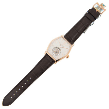 18kt rose gold case with a brown alligator leather strap. Fixed 18kt rose gold bezel. Silver dial with gold-toned hands and index hour markers. Minute markers around the outer rim. Dial Type: Analog. One subdial displaying: tourbillon. Vacheron Constantin Calibre 2795 Hand Wind movement, containing 27 Jewels, composed of 169 parts, bitting at 18000 vph, and has a power reserve of approximately 45 hours. Scratch resistant sapphire crystal. Skeleton transparent exhibition see through case back. Tonneau case shape, case size: 48.24 mm x 38 mm, case thickness: 12.73 mm. Fold over clasp. Water resistant at 30 meters / 100 feet. Functions: tourbillon, hour, minute, second. Malte Series. Luxury watch style. Watch label: Swiss Made. Item Variations: 30130000R-9754 , 30130/000R-9754 , X30R5618. Vacheron Constantin Malte Tourbillon 18kt Rose Gold Brown Leather Men's Watch 30130000R-9754.
