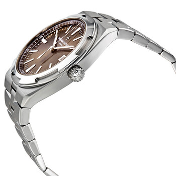Silver-tone stainless steel case with a silver-tone stainless steel bracelet. Fixed silver-tone stainless steel bezel. Brown dial with luminous silver-tone hands and index hour markers. Minute markers around the outer rim. Dial Type: Analog. Luminescent hands and markers. Date display at the 3 o'clock position. Vacheron Constantin Calibre 5100 Automatic movement, containing 37 Jewels, composed of 172 parts, bitting at 28800 vph, and has a power reserve of approximately 60 hours. Scratch resistant sapphire crystal. Screw down crown. Transparent case back. Round case shape, case size: 41 mm, case thickness: 11 mm. Deployment clasp. Water resistant at 150 meters / 500 feet. Functions: date, hour, minute, second. Overseas Series. Luxury watch style. Watch label: Swiss Made. Vacheron Constantin Overseas Automatic Men's Watch 4500V/110A-B146.
