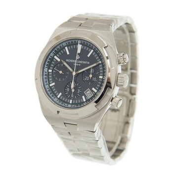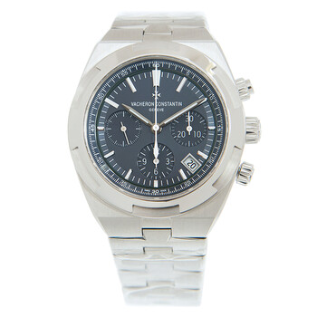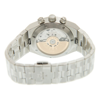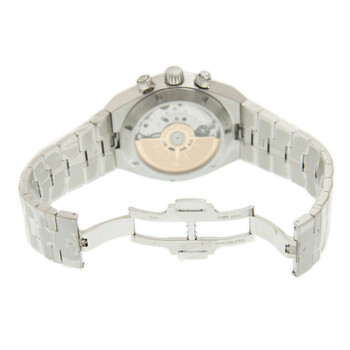 Silver-tone stainless steel case with a silver-tone stainless steel bracelet. Silver-tone stainless steel bezel. Black dial with silver-tone hands and index hour markers. Minute scale around the inner rim. Dial Type: Analog. Luminescent hands and markers. Date display between 4 and 5 o'clock position. Chronograph - three sub-dials displaying: 60 second, 30 minute and 12 hour. Vacheron Constantin Calibre 5200 Automatic movement, containing 54 Jewels, composed of 263 parts, bitting at 28800 vph, and has a power reserve of approximately 52 hours. Scratch resistant sapphire crystal. Screw down crown. Transparent case back. Round case shape, case size: 42.50 mm, case thickness: 13.7 mm. Deployant clasp. Water resistant at 150 meters / 500 feet. Functions: chronograph, column wheel, date, hour, minute, small second. Overseas Series. Luxury watch style. Watch label: Swiss Made. Vacheron Constantin Overseas Chronograph Automatic Black Dial Men's Watch 5500V/110A-B433.