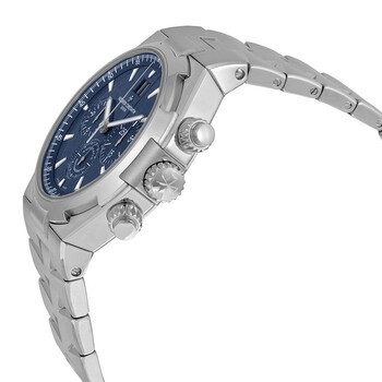 Silver-tone stainless steel case with a silver-tone stainless steel bracelet. Fixed silver-tone stainless steel bezel. Blue dial with luminous hands and index hour markers. Minute markers around the outer rim. Dial Type: Analog. Luminescent hands and markers. Date display at the 12 o'clock position. Chronograph - three sub-dials displaying: 60 second, 30 minute and 12 hour. Vacheron Constantin Calibre 1137 Automatic movement, containing 37 Jewels, bitting at 21600 vph, and has a power reserve of approximately 40 hours. Scratch resistant sapphire crystal. Screw down crown. Solid case back. Round case shape, case size: 42 mm, case thickness: 12.45 mm. Deployment clasp. Water resistant at 150 meters / 500 feet. Functions: chronograph, column wheel, big date, hour, minute, small second. Overseas Series. Luxury watch style. Watch label: Swiss Made. Vacheron Constantin Overseas Chronograph Blue Dial Stainless Steel Men's Watch 49150B01A-9745.