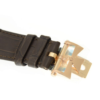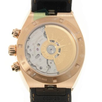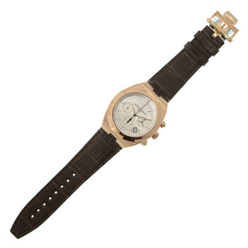 18 carat rose gold case with a brown leather strap. Fixed bezel. Silver dial with rose gold-tone hands and index hour markers. Minute markers around the outer rim. Dial Type: Analog. Luminescent hands and markers. Date display between 4 and 5 o'clock position. Chronograph - three sub-dials displaying: 60 second, 30 minute and 12 hours. Vacheron Constantin Calibre 5200 automatic movement. Scratch resistant sapphire crystal. Screw down crown. Skeleton transparent exhibition see through case back. Case size: 42.5 mm. Case thickness: 13.7 mm. Round case shape. Deployment clasp. Water resistant at 150 meters / 500 feet. Functions: chronograph, date, hour, minute, second. Luxury watch style. Watch label: Swiss Made. Vacheron Constantin Overseas Silver Dial Automatic Men's Chronograph Watch 5500V/000R-B074.