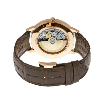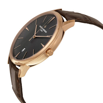 18kt pink gold case with a brown (alligator) leather strap. Fixed 18kt pink gold bezel. Slate grey dial with rose gold hands and index hour markers. Minute markers around the outer rim. Dial Type: Analog. Date display at the 6 o'clock position. Vacheron Constantin calibre 2450 Q6 automatic movement, containing 27 Jewels, composed of 196 parts, bitting at 28800 vph, and has a power reserve of approximately 40 hours. Scratch resistant sapphire crystal. Pull / push crown. Transparent case back. Round case shape. Case size: 40 mm. Case thickness: 8.55 mm. Tang clasp. Water resistant at 30 meters / 100 feet. Functions: date, hour, minute, central seconds. Patrimony Series. Luxury watch style. Watch label: Swiss Made. Item Variations: 85180000R-9166 , 85180/000R-9166 , X85R8611. Vacheron Constantin Patrimony Automatic Men's Watch 85180/000R-9166.