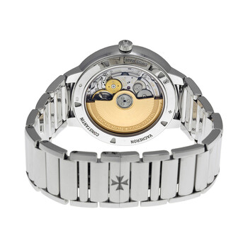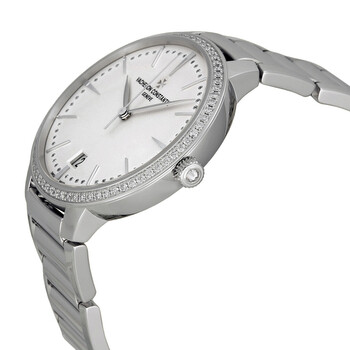 18kt white gold case with a 18kt white gold bracelet. Fixed 18kt rose gold bezel set with 68 diamonds. Silver dial with white gold hands and index hour markers. Minute markers around the outer rim. Dial Type: Analog. Date display at the 6 o'clock position. Vacheron Constantin calibre 2450 Q6 automatic movement, containing 27 Jewels, composed of 196 parts, bitting at 28800 vph, and has a power reserve of approximately 40 hours. Scratch resistant sapphire crystal. Pull / push crown. Exhibition case back. Round case shape. Case size: 36.5 mm. Case thickness: 9.15 mm. Hidden fold over clasp. Water resistant at 30 meters / 100 feet. Functions: date, hour, minute, second. Patrimony Series. Luxury watch style. Watch label: Swiss Made. Item Variations: 85515CA1G-9841 , 85515/CA1G-9841 , X85G7267. Vacheron Constantin Patrimony Contemporaine Silver Dial White Gold Ladies Watch 85515CA1G-9841.