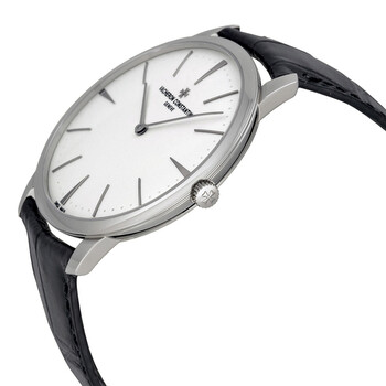 18kt white gold case with a black (alligator) leather strap. Fixed 18kt white gold bezel. Silver dial with white gold hands and index hour markers. Minute markers around the outer rim. Dial Type: Analog. Vacheron Constantin calibre 1400 hand wind movement, containing 20 Jewels, composed of 98 parts, bitting at 28800 vph, and has a power reserve of approximately 40 hours. Scratch resistant sapphire crystal. Pull / push crown. Solid case back. Round case shape. Case size: 40 mm. Case thickness: 6.7 mm. Band width: 20.3 mm. Band length: 8 inches. Tang clasp. Water resistant at 30 meters / 100 feet. Functions: hour, minute. Patrimony Series. Luxury watch style. Watch label: Swiss Made. Item Variations: 81180000G-9117 , 81180/000G-9117 , X81G6987. Vacheron Constantin Patrimony Grand Taille White Gold Men's Watch 81180000G-9117.