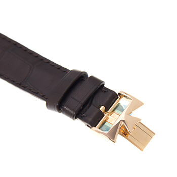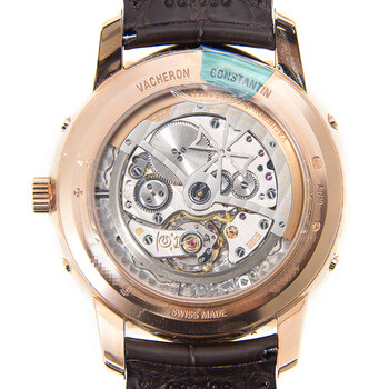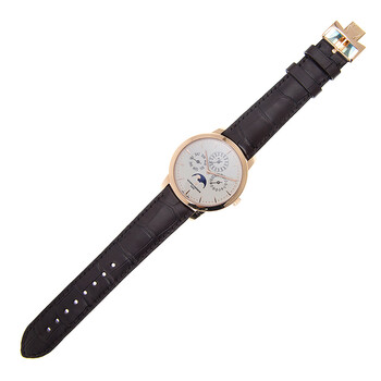 18kt pink gold case with a dark brown alligator leather strap. Fixed 18kt pink gold bezel. White dial with gold-toned hands and index hour markers. Minute markers around the outer rim. Dial Type: Analog. Perpetual calendar. Four sub-dials displaying: month/leap year, date, day and moonphase. Vacheron Constantin Calibre 1120 QP Automatic movement, containing 36 Jewels, composed of 276 parts, bitting at 19800 vph, and has a power reserve of approximately 40 hours. Scratch resistant sapphire crystal. Transparent see through case back. Round case shape, case size: 41 mm, case thickness: 8.96 mm. Fold over clasp. Water resistant at 30 meters / 100 feet. Functions: perpetual calendar, leap year, moon phase, month, date, day, hour, minute. Patrimony Series. Luxury watch style. Watch label: Swiss Made. Item Variations: 43175000R-9687 , 43175/000R-9687 , X43R4740. Vacheron Constantin Patrimony Perpetual Calendar Pink Gold Men's Watch 43175000R-9687.