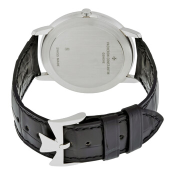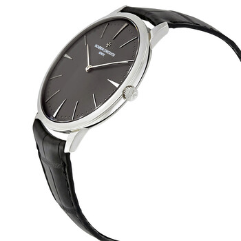 White platinum case with a black (alligator) leather strap. Fixed white platinum bezel. Slate gray dial with silver-tone hands and index hour markers. Minute markers around the outer rim. Dial Type: Analog. Vacheron Constantin calibre 1400 hand wind movement, containing 20 Jewels, composed of 98 parts, bitting at 28800 vph, and has a power reserve of approximately 40 hours. Scratch resistant sapphire crystal. Pull / push crown. Solid case back. Round case shape. Case size: 40 mm. Case thickness: 6.79 mm. Tang clasp. Water resistant at 30 meters / 100 feet. Functions: hour, minute. Patrimony Series. Luxury watch style. Watch label: Swiss Made. Item Variations: 81180000P-9539 , 81180/000P-9539 , X81P2723. Vacheron Constantin Patrimony Men's Watch 81180/000P-9539.